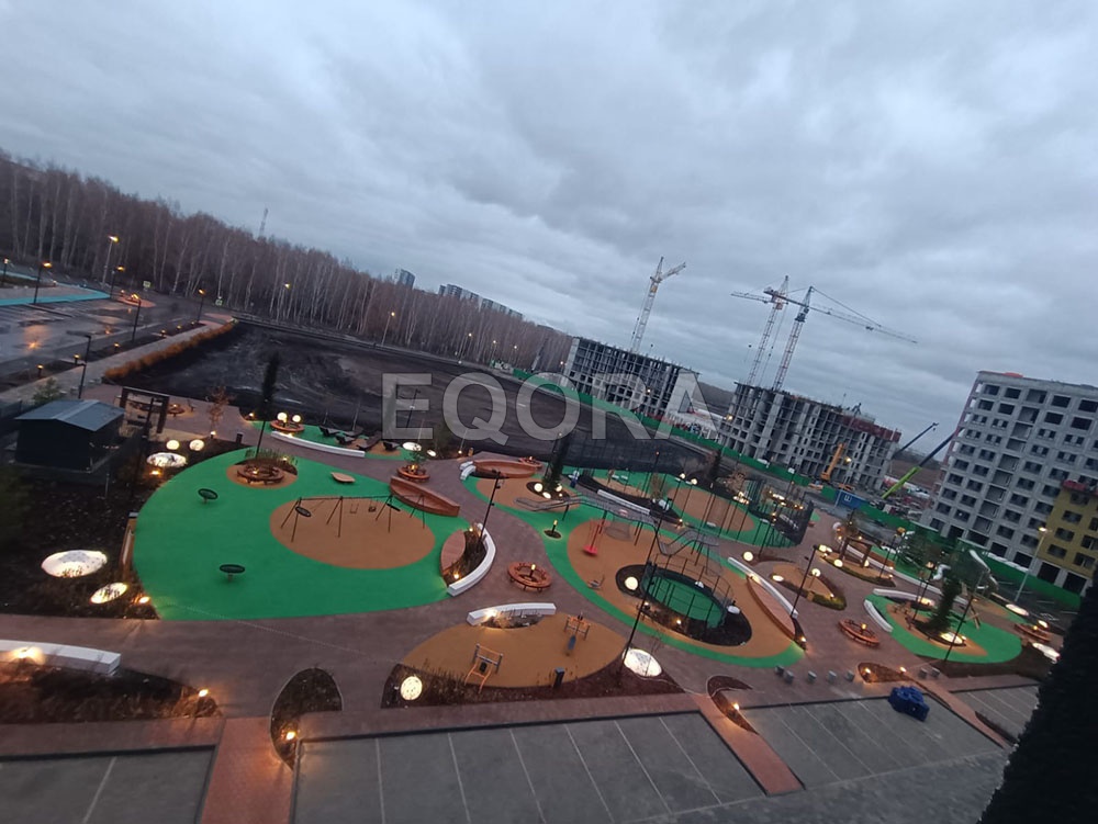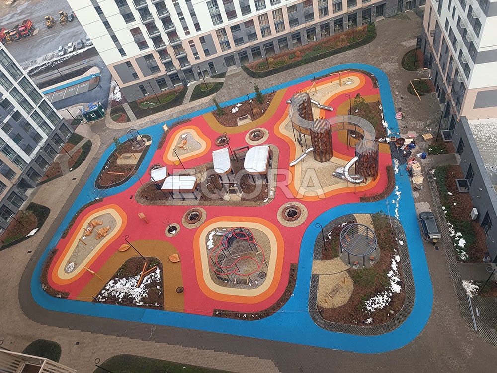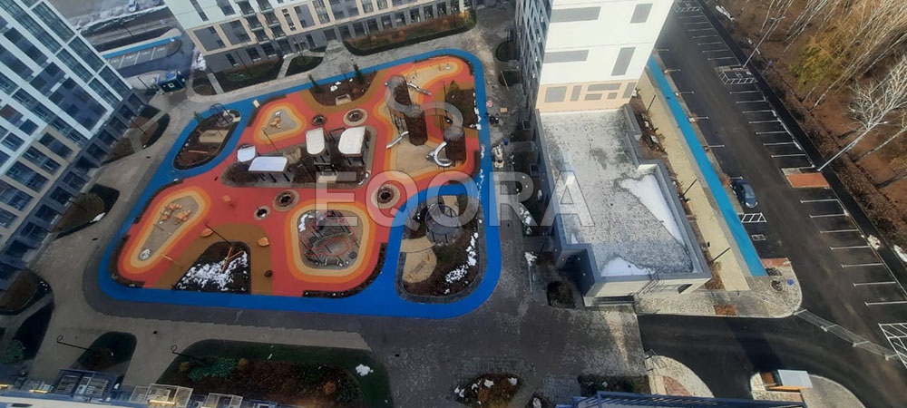 Устройство бесшовного покрытия из каучуковой EPDM крошки EQORA с амортизирующей подложкой толщина от 20 до100 мм Объект: ЖК «Мотивы» город Тюмень Площадь: 3500 м2